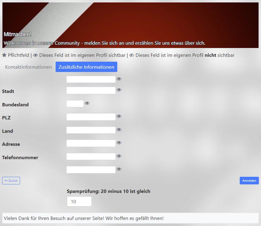 - Nach korrekter Eingabe der Spamprüfung (kleine Rechenaufgabe) kommt Ihr über "Anmelden" zum Abschluß des initialen Registrierungsprozesses
