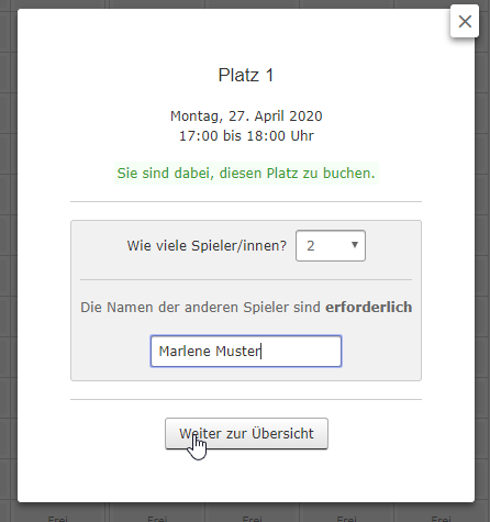 3. Zur Buchung muss der 2. Spieler mit vollem Vor- und Zunamen zwingend angegeben werden. Danach "Weiter zur Übersicht".