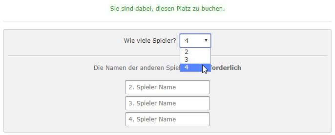 Bei Buchungen für Doppel können zusätzlich auch die weiteren Mitspieler angegeben werden. Dazu ist bei der Spieleranzahl die Menge 4 auszuwählen.