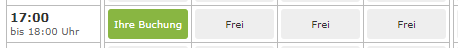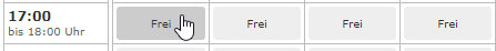 1. Einen freien Platz auswählen (Freie Plätze sind in der Kalenderübersicht mit "Frei" gekennzeichnet). Stunden, die in der Vergangenheit liegen ("Vorbei") oder noch "Zu fern" in der Zukunft, sind nicht buchbar, ebenso wie bereits belegte Stunden.