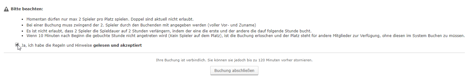 4. Zum Abschluss der verbindlichen Buchung, müssen die angezeigten Regeln durch Aktivierung des "Häkchens" akzeptiert werden. Danach kann die Buchung abgeschlossen werden.