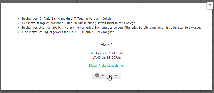 2. nach Auswahl der gewünschten Stunde, auf einem der 4 Plätze, bekommt Ihr nochmal detailierte Informationen zur gewünschten Buchung angezeigt. Seid Ihr damit einverstanden, bitte über den Button "Jetzt Buchen" bestätigen.