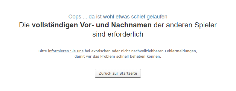 In jedem Fall müssen bei der Buchung zwingend alle Mitspieler mit Vor- und Nachnamen angegeben werden, sonst wird die Buchung nicht vom System akzeptiert und Ihr bekommt folgende Meldung: