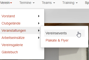 Unter Veranstaltungen gibt es ein weiteres Submenü "Vereinsevents". Dort findet Ihr die kommenden Vereinsevents und könnt bei Auswahl eines Events dann auch Eure Teilnahme oder auch Absage eintragen, soweit dies be dem entsprechenden Event bereits freigegeben wurde. Auch seht Ihr neben den Informationen zum Event wie Beschreibung,Ort,und Zeit, auch die maximale Anzahl der Teilnehmenden, sowie die Mitglieder, die bereits zugesagt haben.